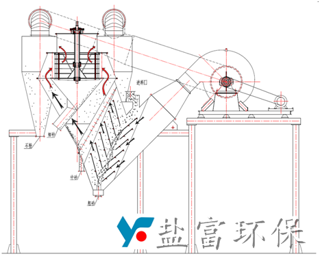 鹽富環(huán)保公司生產(chǎn)的YF-SF復合選粉機是將靜態(tài)的V型選粉機和內(nèi)循環(huán)高效渦流選粉機有機結合,可分級粒徑為4.75mm甚至 粒徑達10mm以上的物料。來料首先通過靜態(tài)的V選進行粗細分離,中砂和細砂隨上升的氣流進入高效渦流選粉機進行分級,石粉則被旋風筒收集。從老式的轉子選粉機只能對機制砂簡單脫粉到實現(xiàn)粗、中、細砂的 分級。